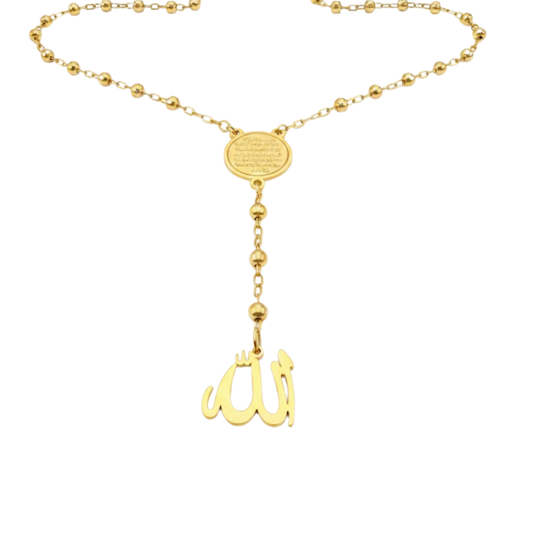 14k YG 3.85mm Faceted Balls Paperclip Rosary Bracelet 1.65mm wide . 16mm engraved disk, 45CM. 5.5cm drop with Allah pendant 15x17mm - RB016