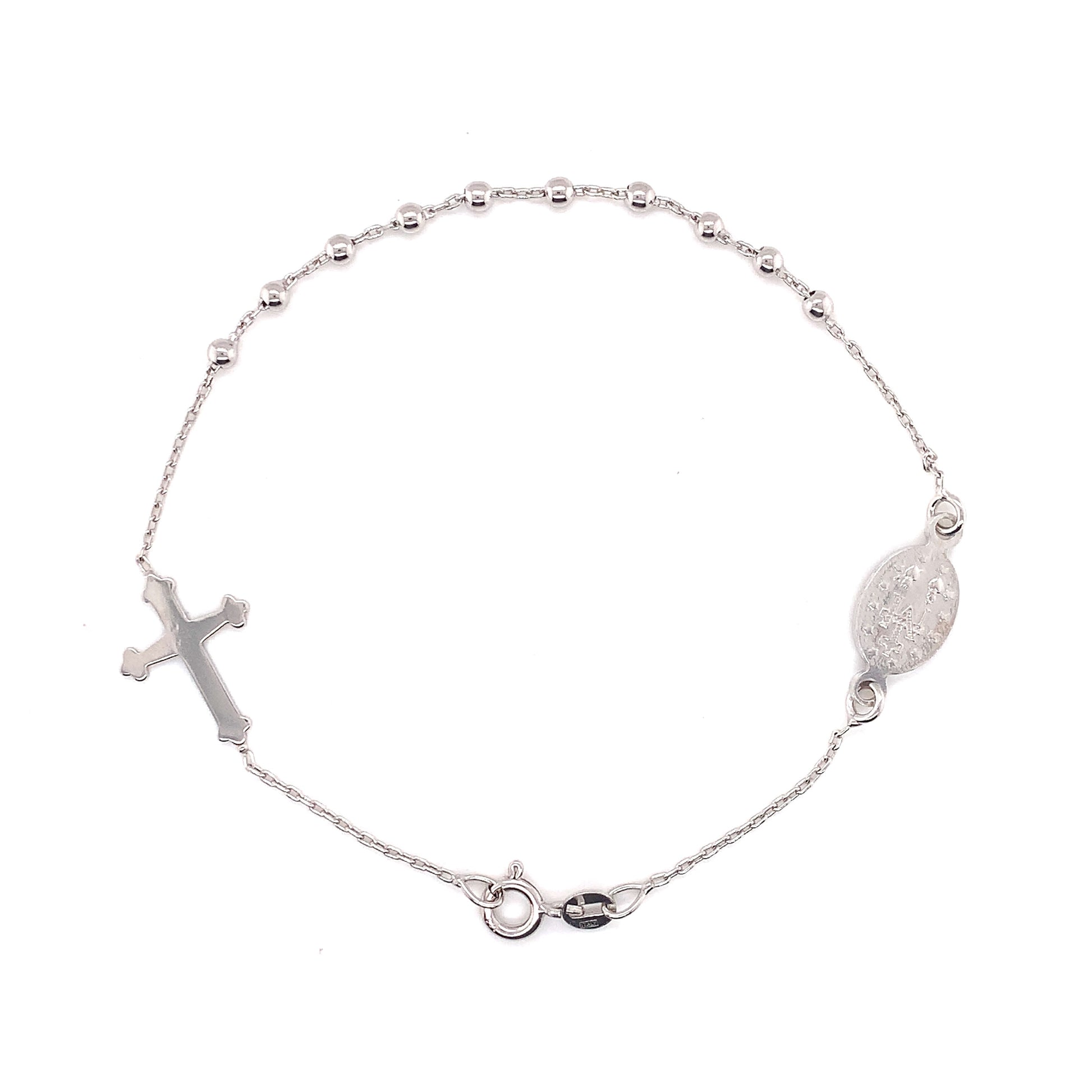 9k White Gold Italian Solid Oval Link Chain 0.70mm wide. With 2.5mm Beads Miraculous Madonna and Cross. Available in various sizes